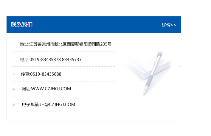 地址:常州市新北區友邦商務大廈1幢16、17層  電話:0519-85101652  傳真:0519-85112595  郵編:213022  網址:www_cz-jiayue_cn.ahxindajx.com  郵箱:xiajifengaa@163.com
